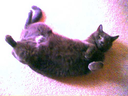 09 Sep 04: La Vache hangs out with her red feather. Another upside down kitty.