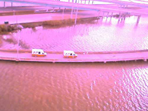 I flew over these Emergengy vehicles and wondered what was going on. They had a 20 ft aligator hanging out on the on-ramp to I-10. So of course I had to fly back over and take a picture. Notice the people are not too close to the gator - I was impressed they were that smart. Later, I flew back over them and they were dousing the gator with buckets of water... Thousands of people are without power, water, and food, and these guys are watering a gator.