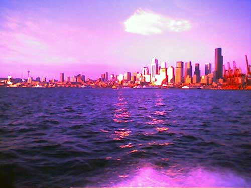 24 Sep 04: After working with the ship on Friday, they put us ashore by small boat from the station. Here's a view of the Seattle skyline from the water at sunset.