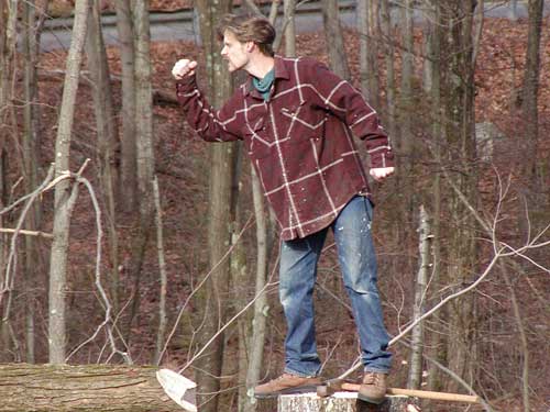 24 Dec 04: Andy decided to do the cutting of a maple tree that was near the new garage. We tied it off to another tree and good thing - the tree fell opposite to gravity, the wind, the cut, everything. The rope kept it out of the yard at least. And mostly off the Garage. In this pic he shows his true feelings for the tree...