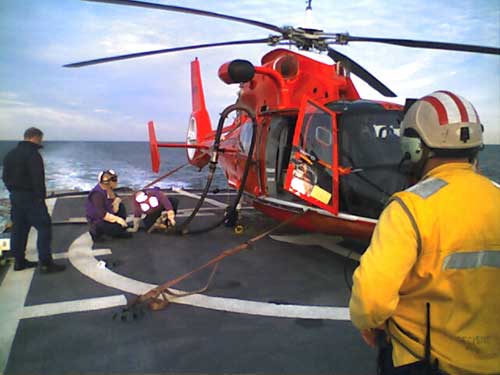02 Dec 04: Went to the ship today, needed to get landings. The ship was doing their last day of STAN. In this picture they're fueling the helicopter before the night operations.