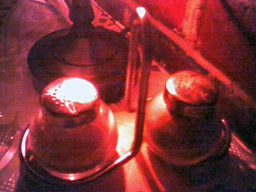 14 Dec 04: We went to the Brauhaus on Main Street in Portsmouth. Since we were there in uniform for lunch, we didn't have any Brau, so that'll have to wait until the next trip. All told we never went back to the same place twice. Below is a picture of the salt and pepper holder on the table. I liked the way the holder and the handle were all part of the same piece of wire. It goes with my affinity for the Just Noticeable Difference. It makes *all* the difference.